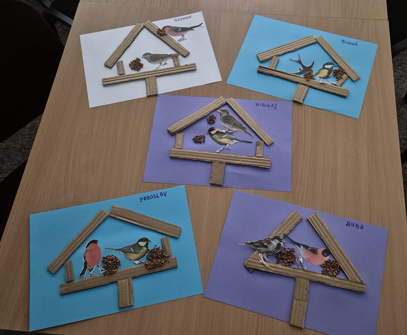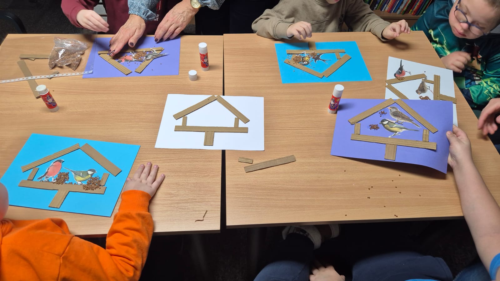 Pani Ewa przeczytała dzieciom opowiadanie o ptaszkach przygotowujących się do zimy. Przedszkolaki rozpoznawały i nazywały poszczególne ptaki: sikorka, wróbelek, gil. I tak jak dzieci w opowiadaniu zrobiły prawdziwy karmnik dla ptaków, również my wykonaliśmy prace plastyczne przyklejając z tekturowych pasków karmnik, a w środku kolorowe ptaszki. Nie zabrakło dla nich jedzenia. Wzięliśmy ze sobą ziarenka kaszy i przykleiliśmy je w ptasich domkach. Prace wyszły piękne.