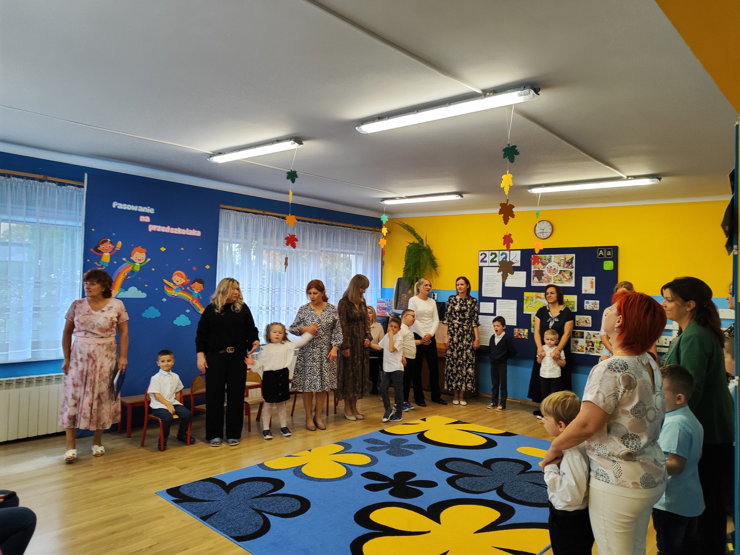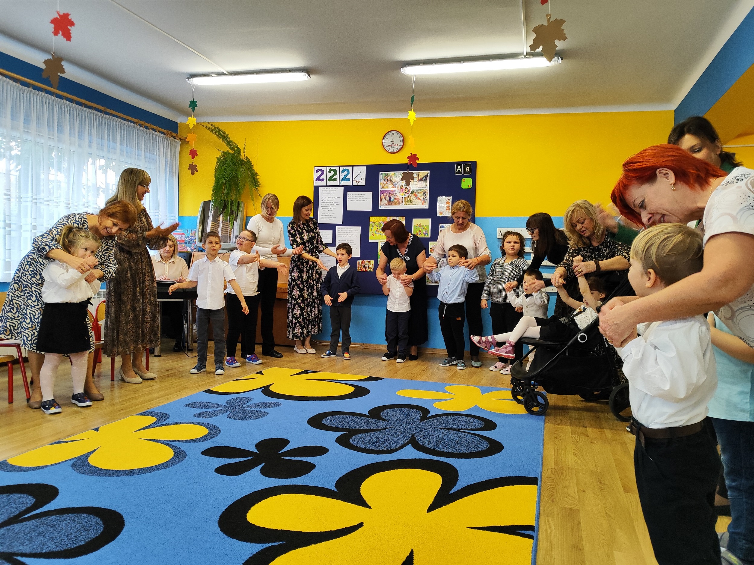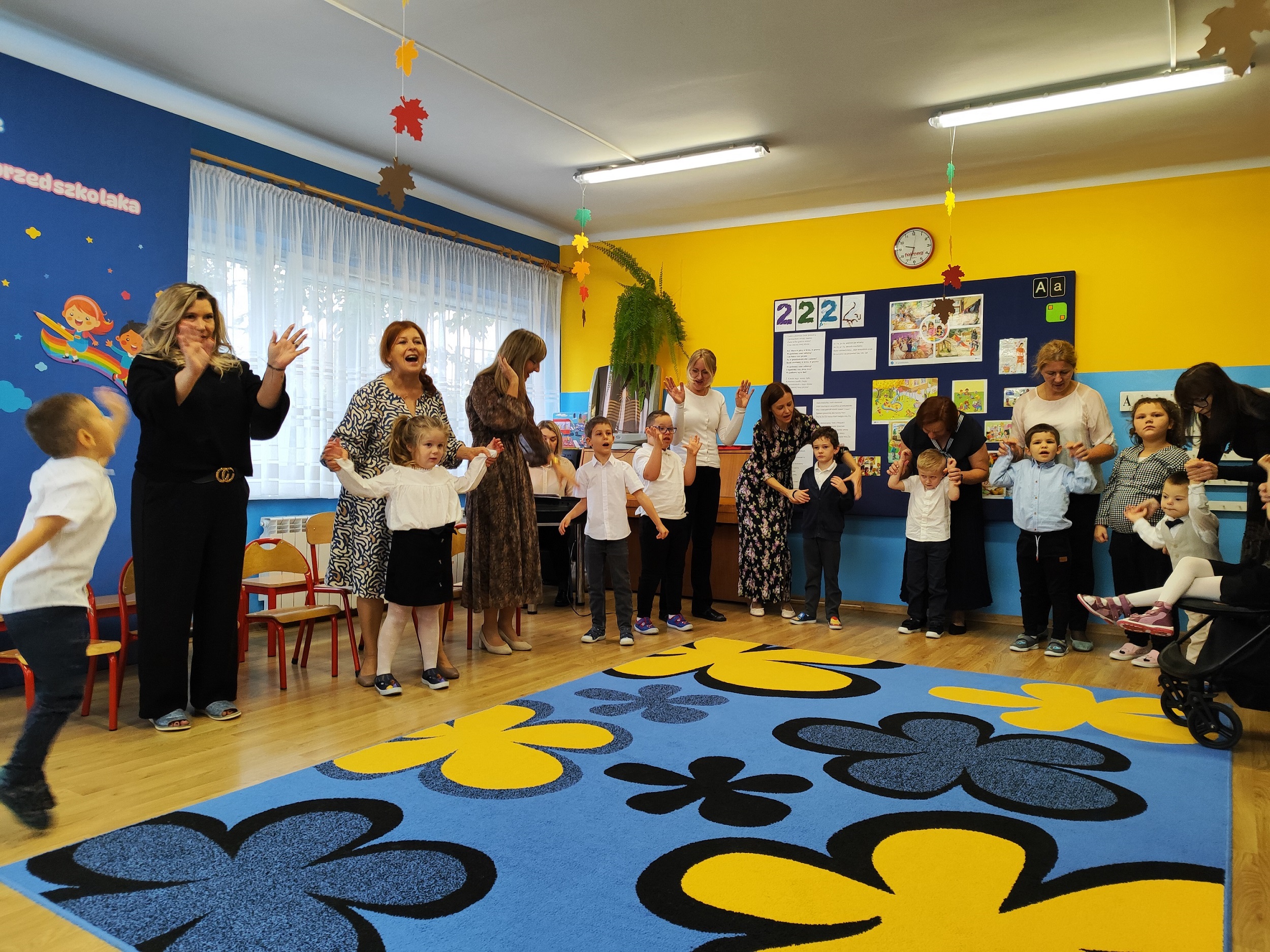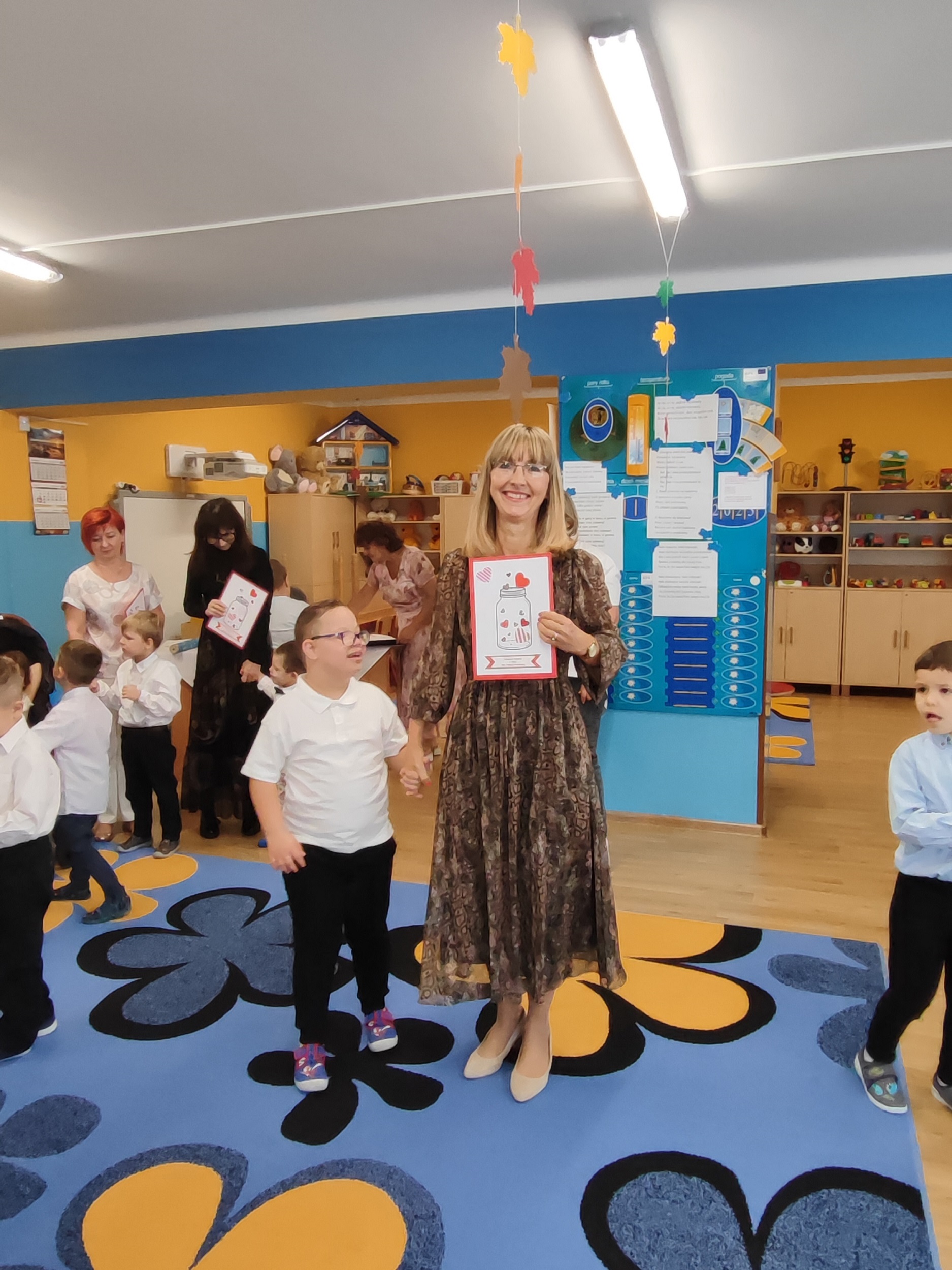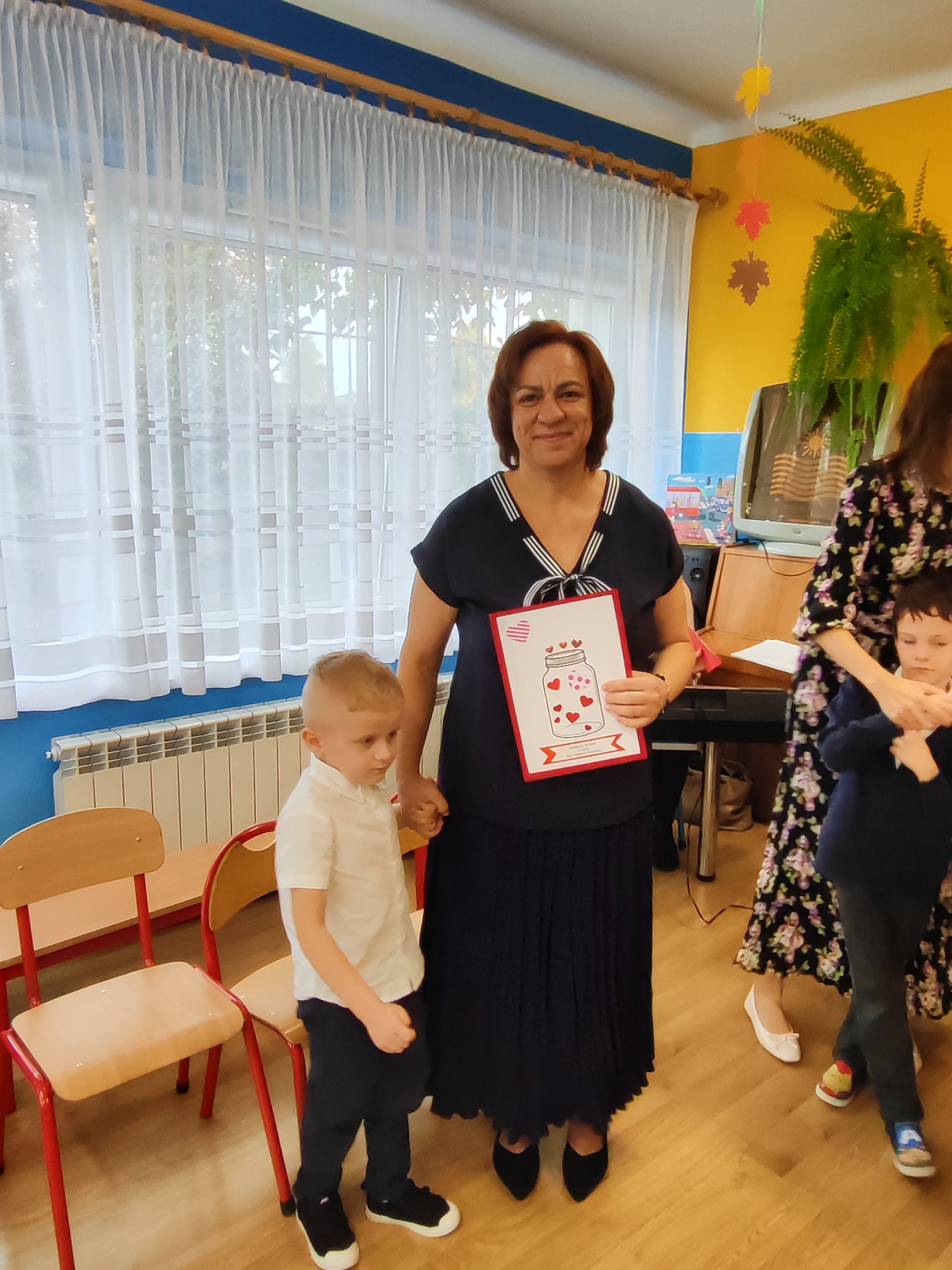 Ostatnia część uroczystości została poświęcona pracownikom oświaty, którzy w tym dniu obchodzili swoje święto. Z tej okazji Pani dyrektor złożyła wszystkim nauczycielom i personelowi przedszkola życzenia zdrowia, satysfakcji pracy z dziećmi oraz szacunku i społecznego uznania. Przedszkolaki okazały swoją wdzięczność rozdając opiekunom własnoręcznie wykonane laurki.