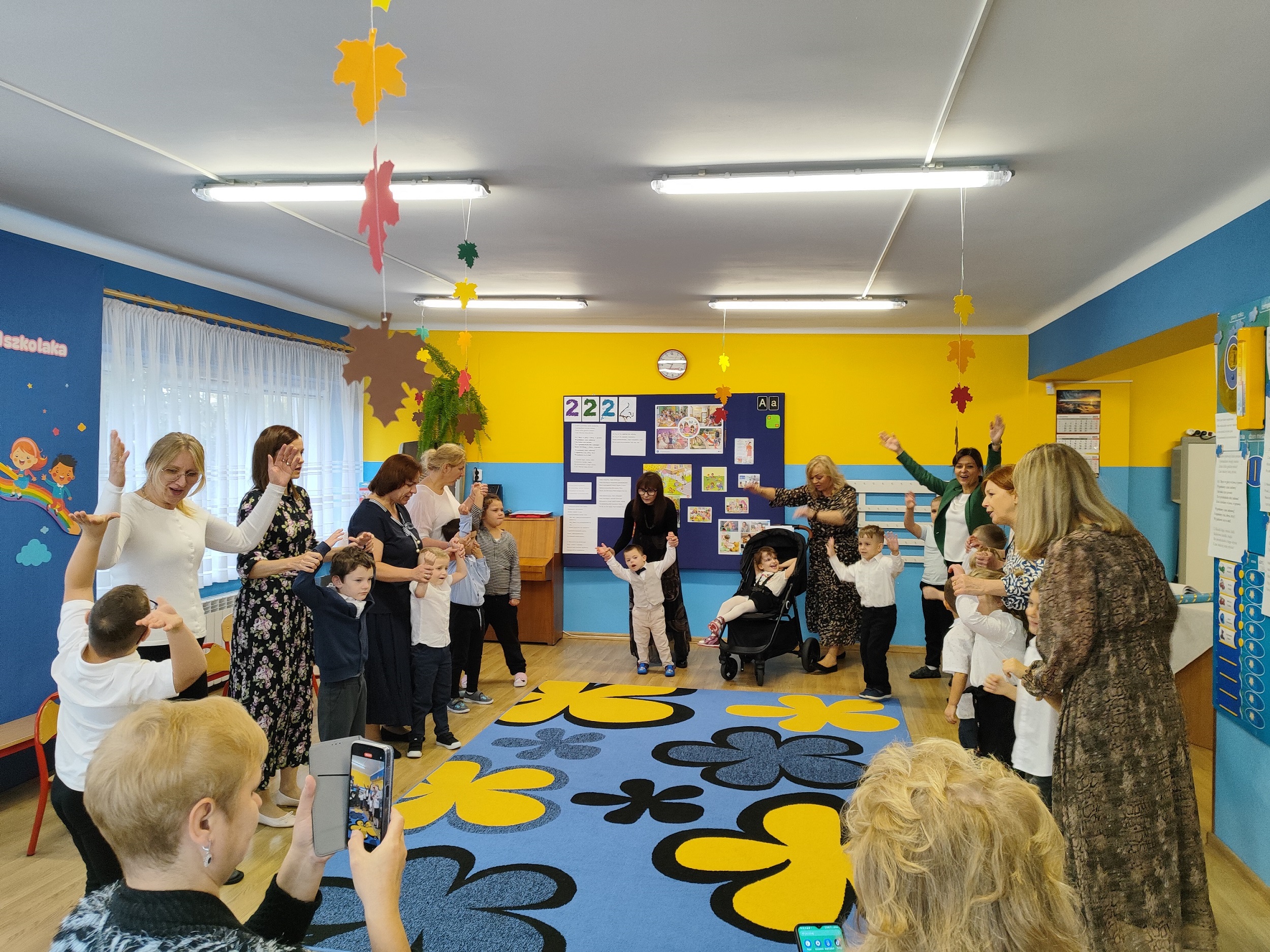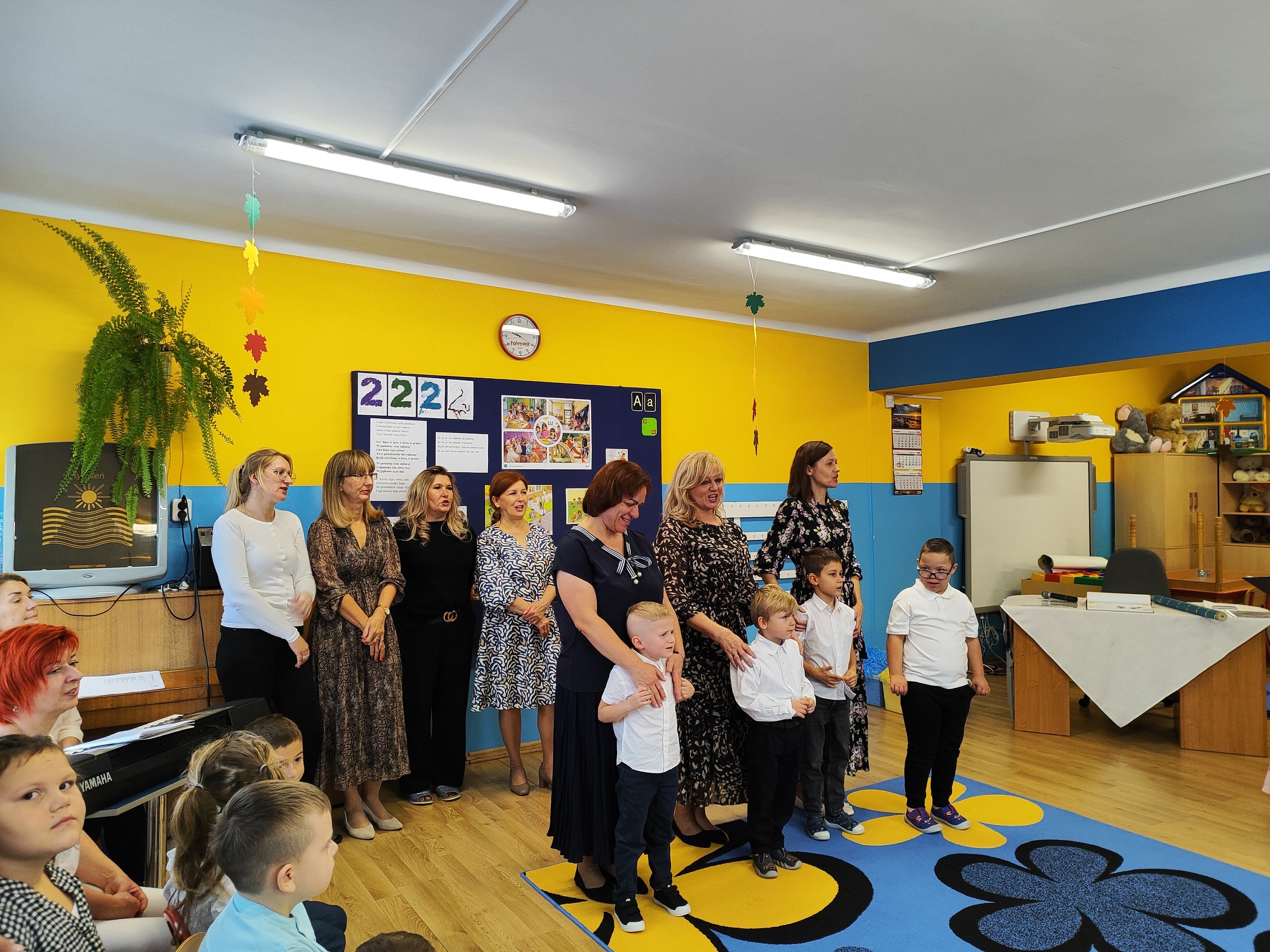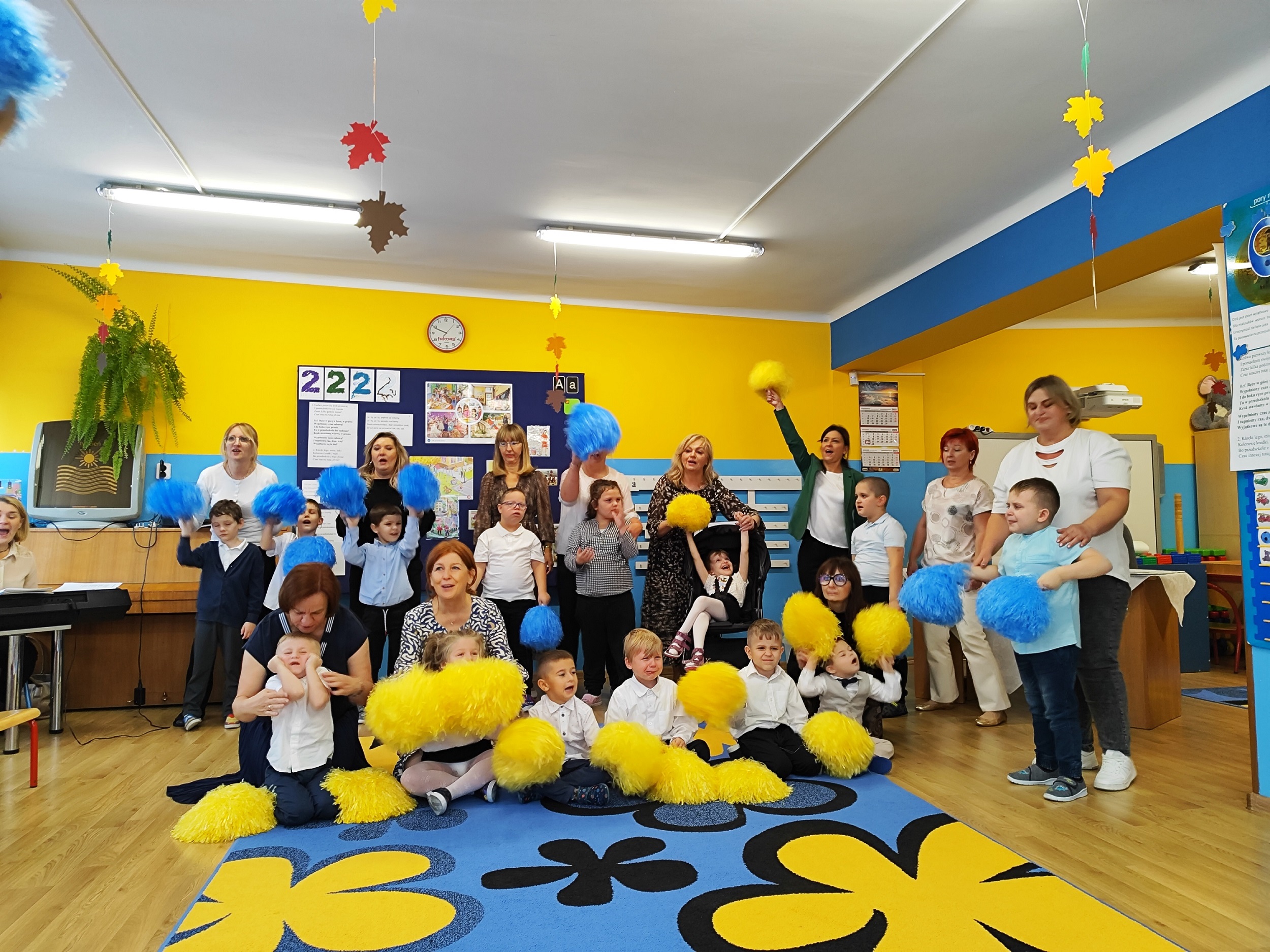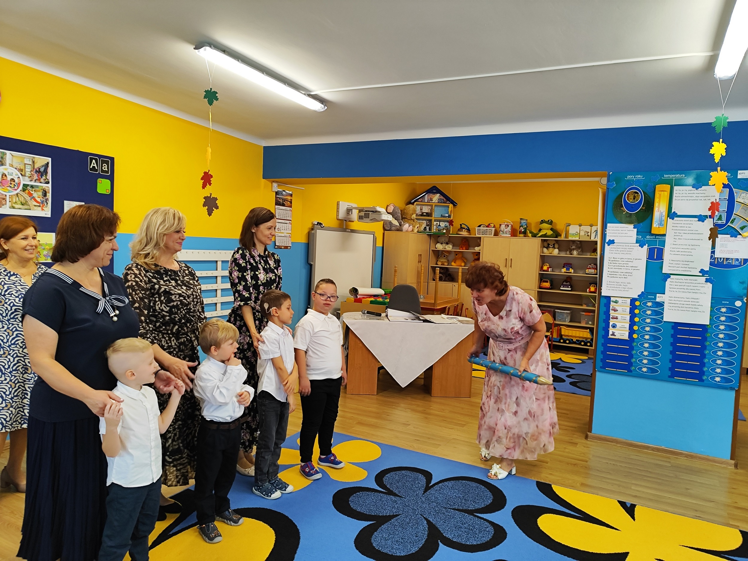 Ostatnia część uroczystości została poświęcona pracownikom oświaty, którzy w tym dniu obchodzili swoje święto. Z tej okazji Pani dyrektor złożyła wszystkim nauczycielom i personelowi przedszkola życzenia zdrowia, satysfakcji pracy z dziećmi oraz szacunku i społecznego uznania. Przedszkolaki okazały swoją wdzięczność rozdając opiekunom własnoręcznie wykonane laurki.