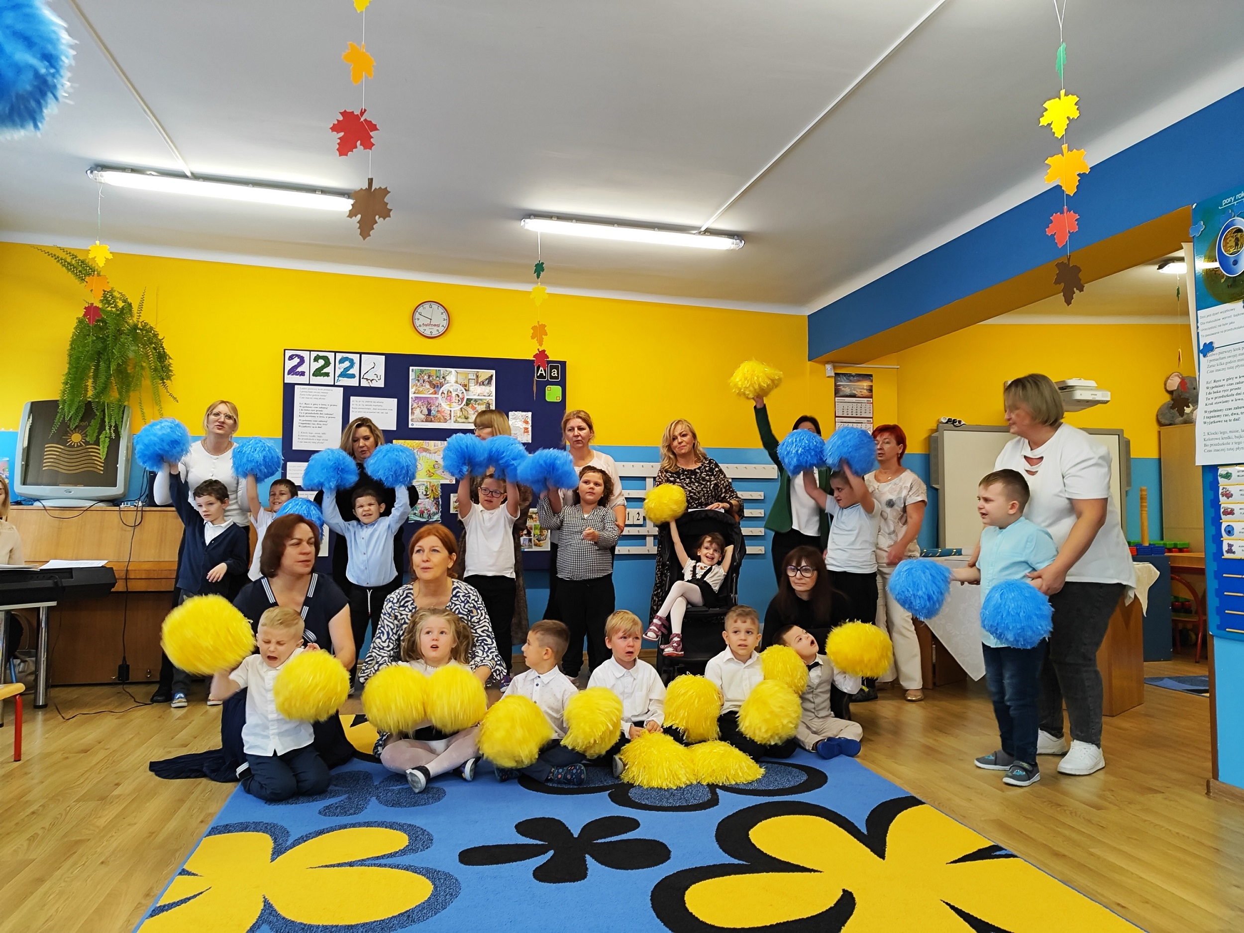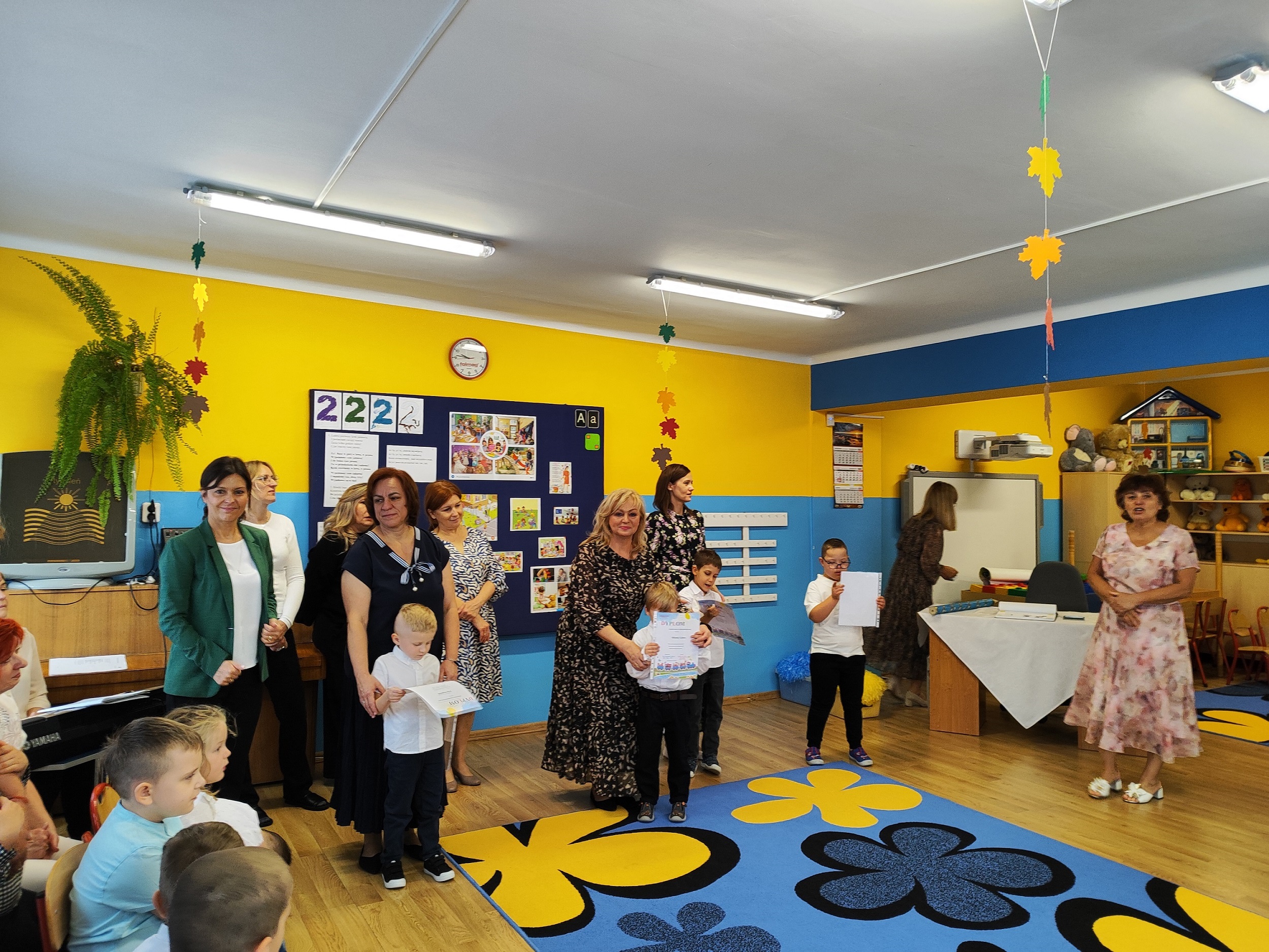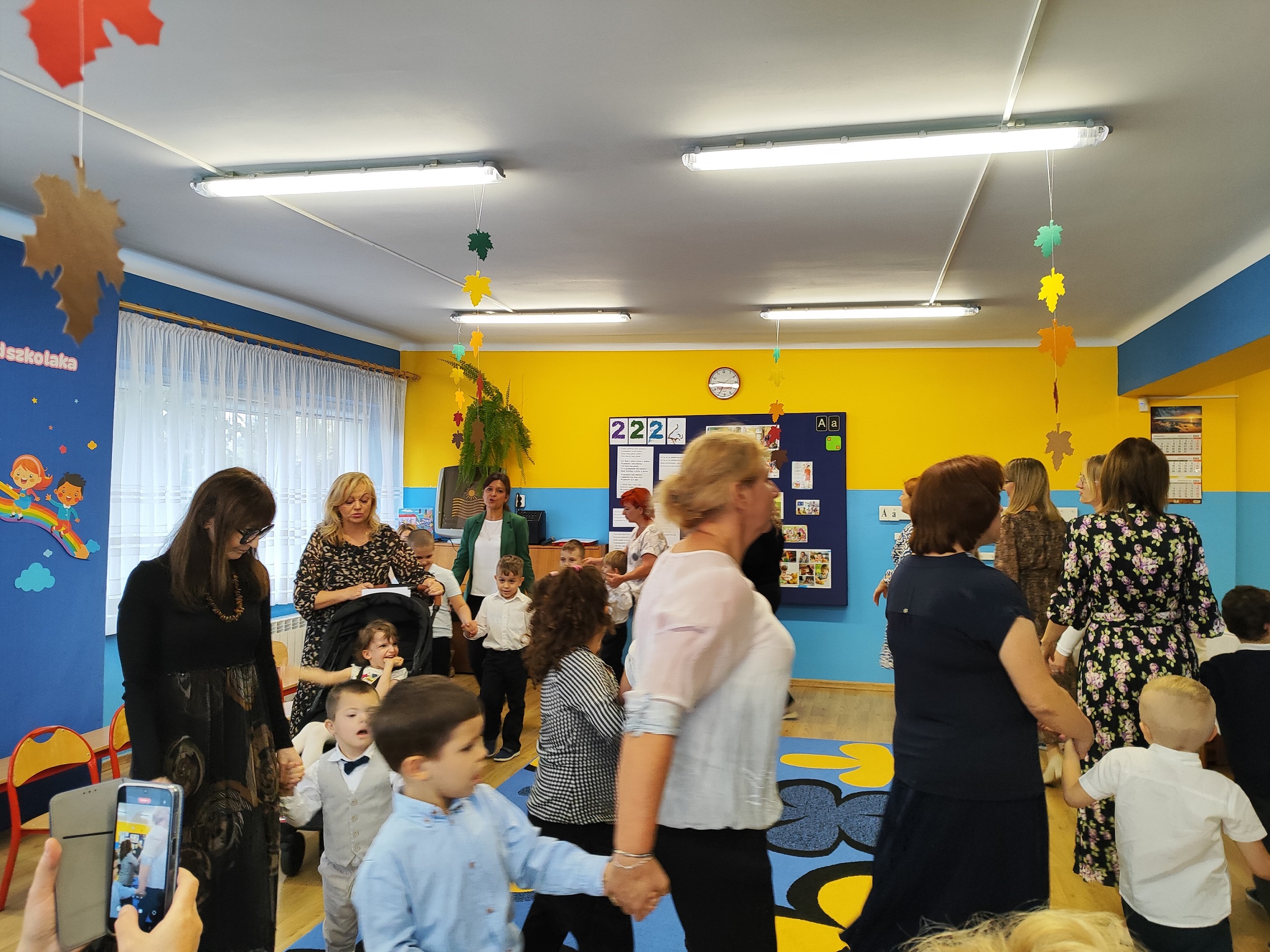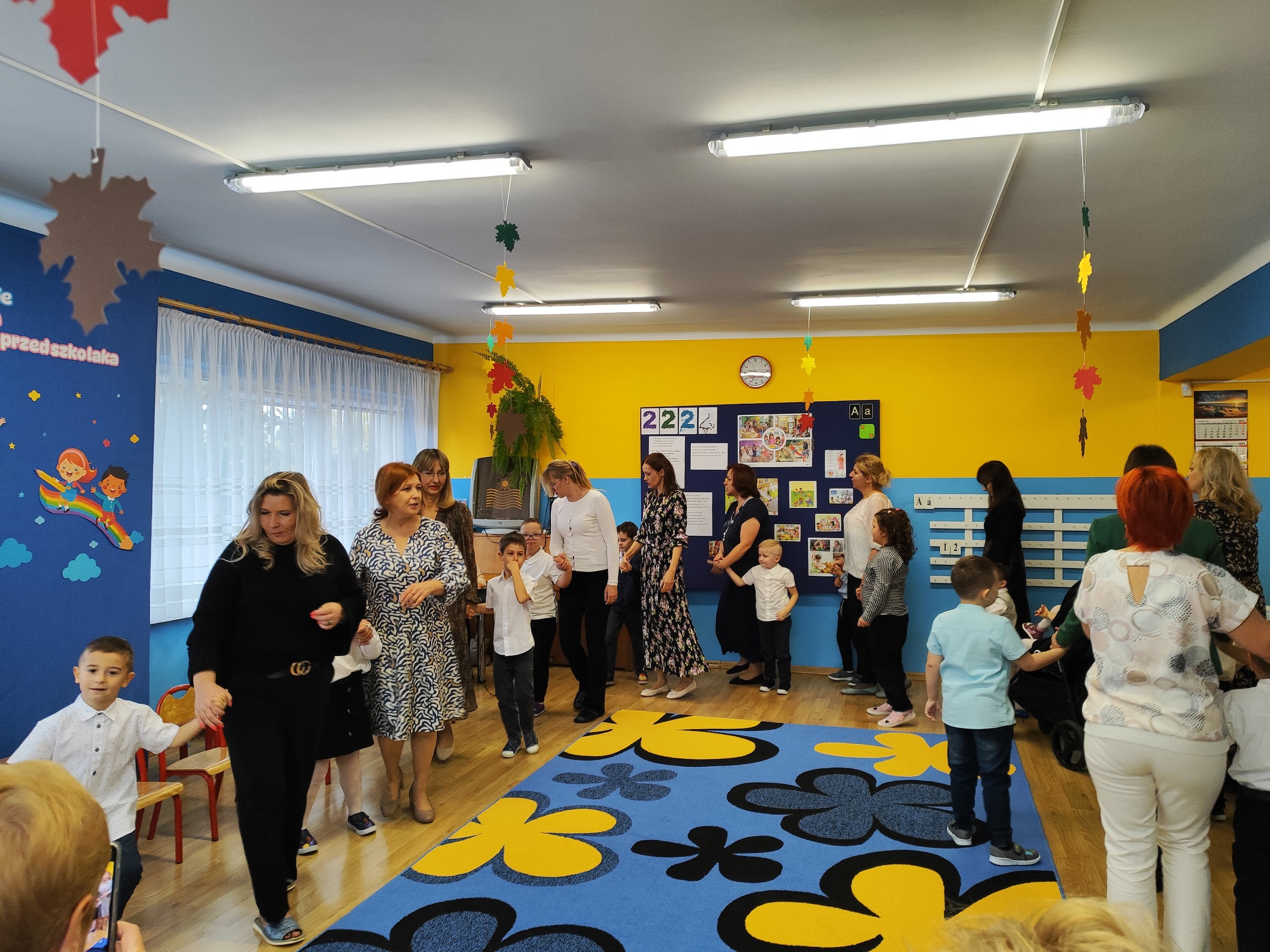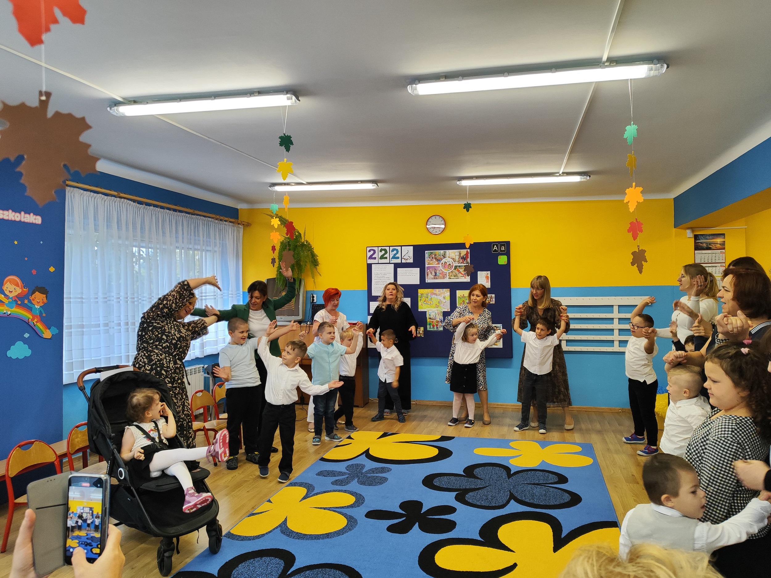 Ostatnia część uroczystości została poświęcona pracownikom oświaty, którzy w tym dniu obchodzili swoje święto. Z tej okazji Pani dyrektor złożyła wszystkim nauczycielom i personelowi przedszkola życzenia zdrowia, satysfakcji pracy z dziećmi oraz szacunku i społecznego uznania. Przedszkolaki okazały swoją wdzięczność rozdając opiekunom własnoręcznie wykonane laurki.