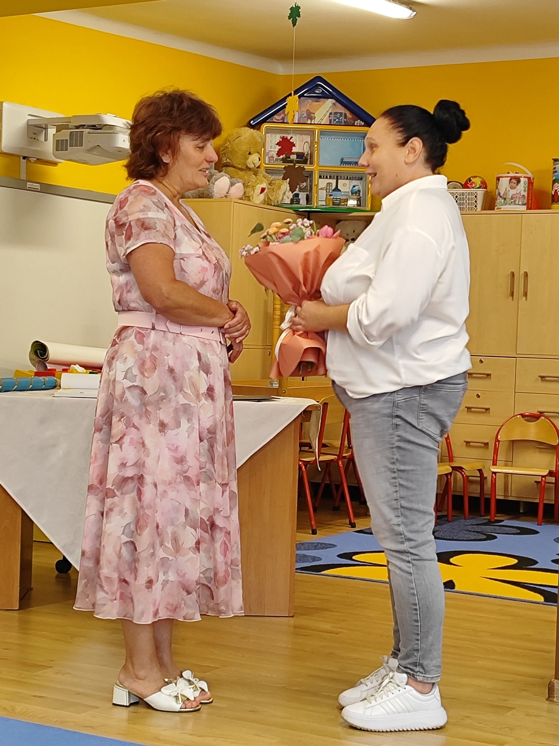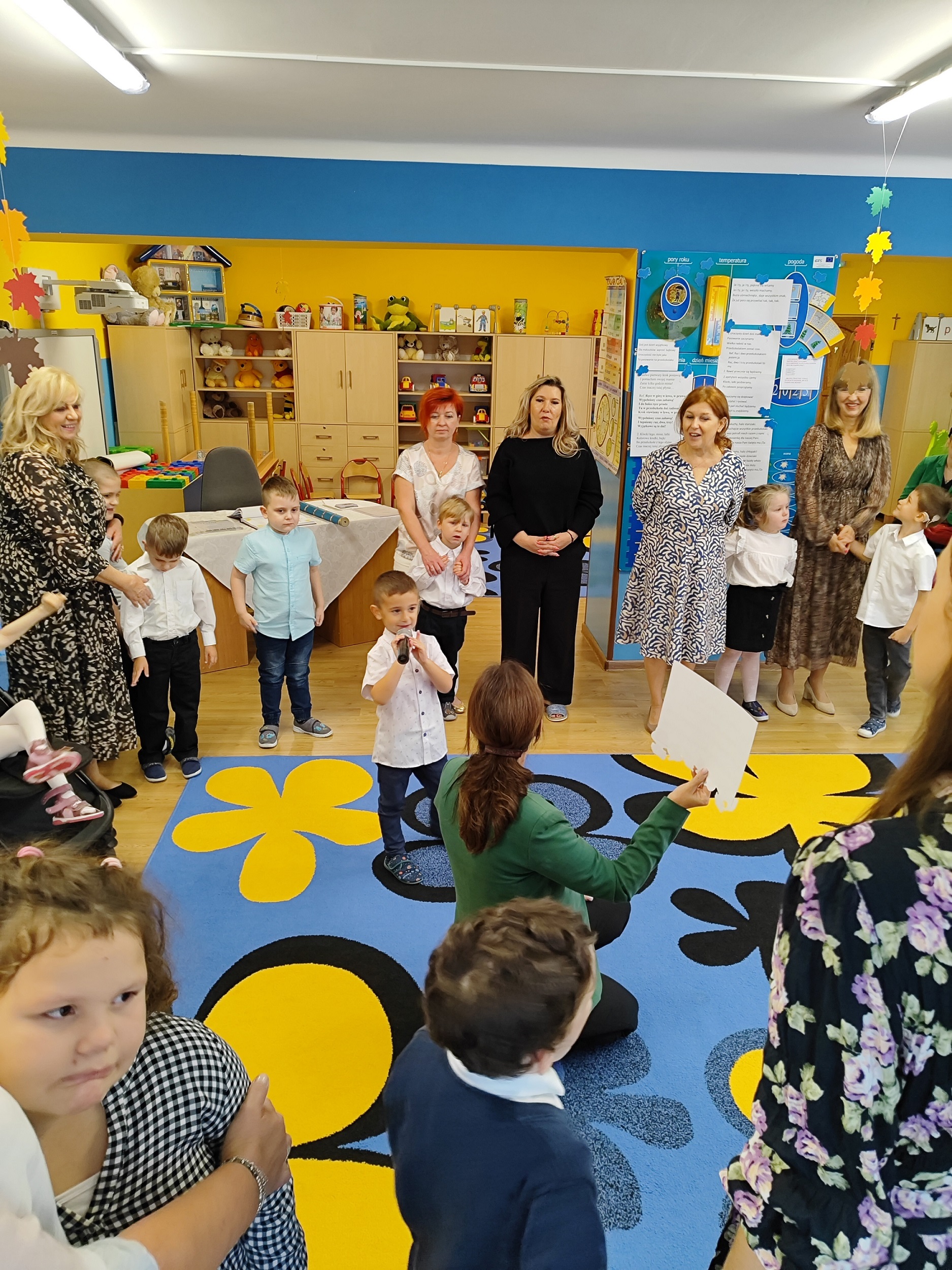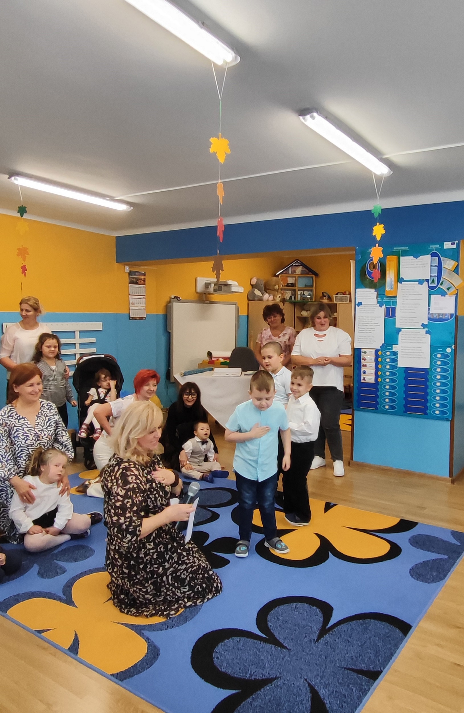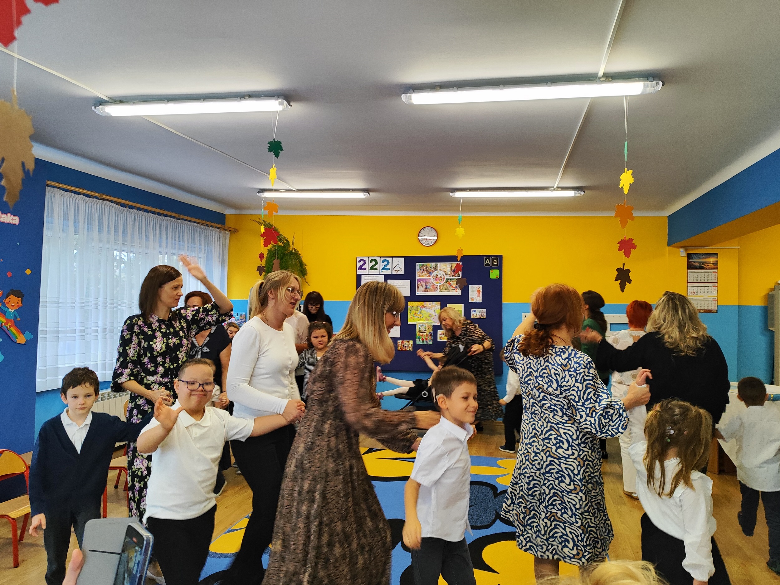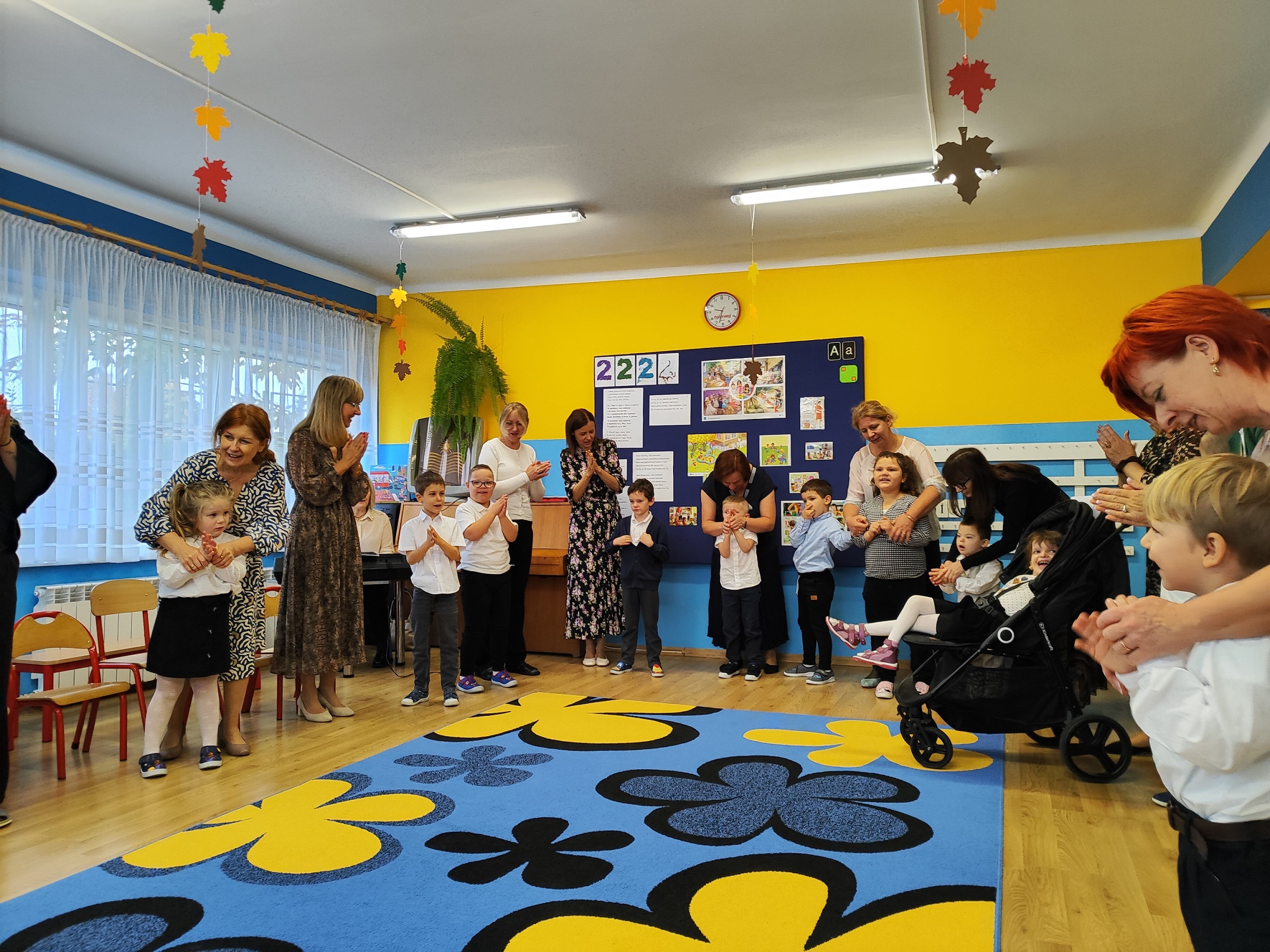 Ostatnia część uroczystości została poświęcona pracownikom oświaty, którzy w tym dniu obchodzili swoje święto. Z tej okazji Pani dyrektor złożyła wszystkim nauczycielom i personelowi przedszkola życzenia zdrowia, satysfakcji pracy z dziećmi oraz szacunku i społecznego uznania. Przedszkolaki okazały swoją wdzięczność rozdając opiekunom własnoręcznie wykonane laurki.