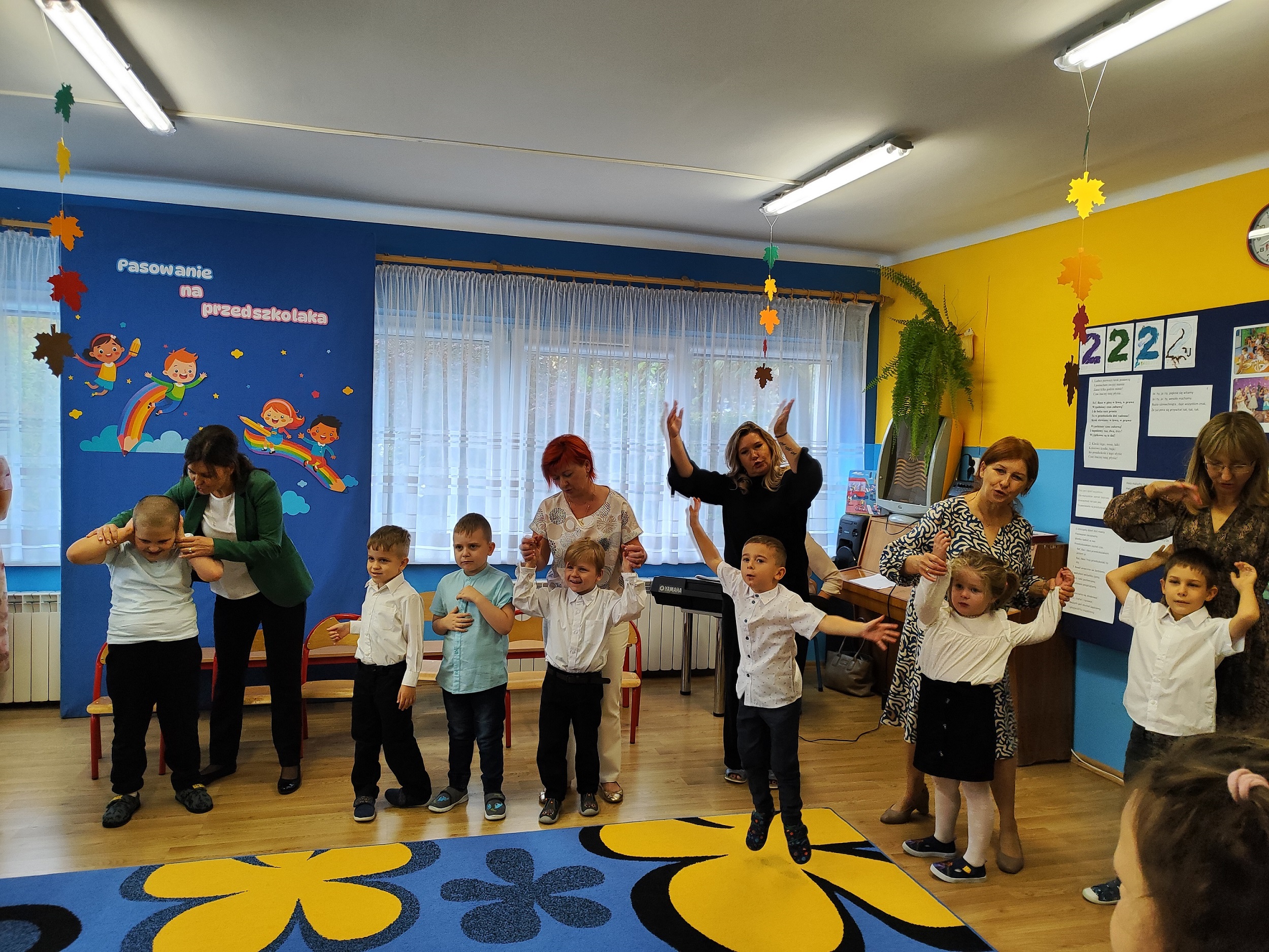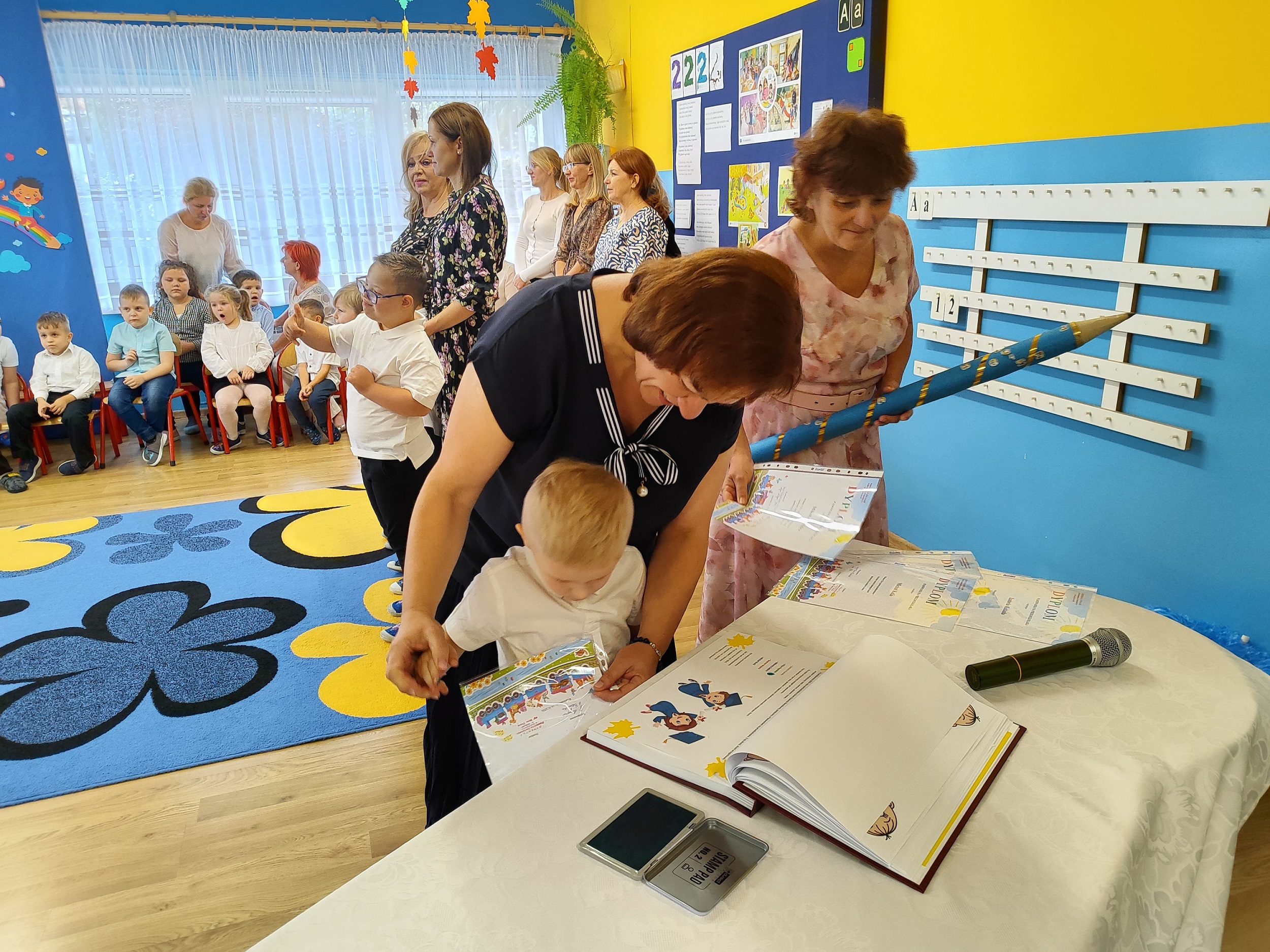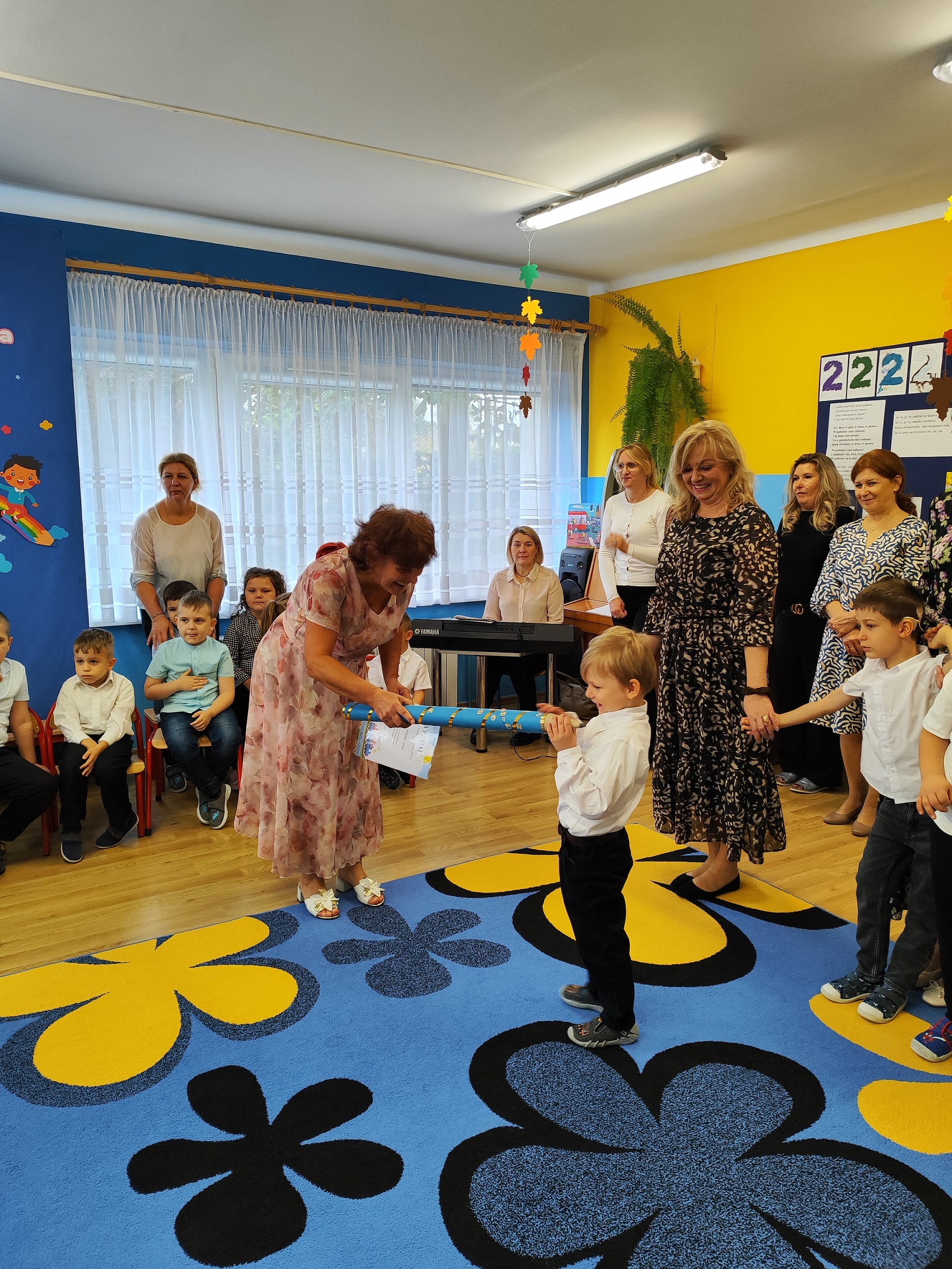 W tym roku uroczystość Pasowania na przedszkolaka odbyła się 14 października. Pani dyrektor Maria Klauza powitała przedszkolaków oraz przybyłych gości. Następnie dzieci zaprezentowały program artystyczny. W wierszach, tańcach i piosenkach pokazały jak w przedszkolu bawią się, uczą, poznają świat i stają się coraz bardziej samodzielne. Niejednej mamie oraz tacie łza wzruszenia zakręciła się w oku z dumy i radości, że oto ich pociecha staje się prawdziwym przedszkolakiem. Po części artystycznej nastąpił Akt pasowania. Pani dyrektor symbolicznym dotknięciem „zaczarowanego ołówka” przyjęła do grona naszych wychowanków czworo dzieci: Szymona, Michała, Mikołaja i Filipa. Na pamiątkę tego wyjątkowego wydarzenia dzieci otrzymały piękne dyplomy oraz dokonały „wpisu” do Kroniki przedszkola odciskając swoje paluszki.