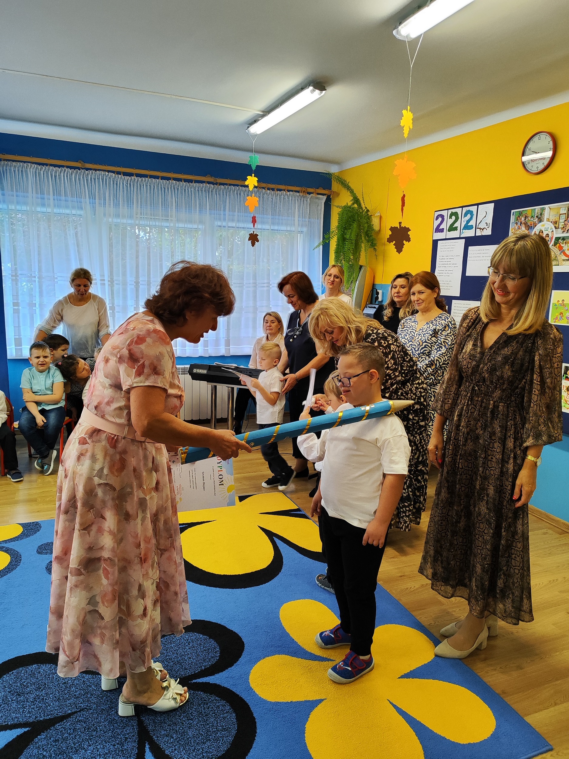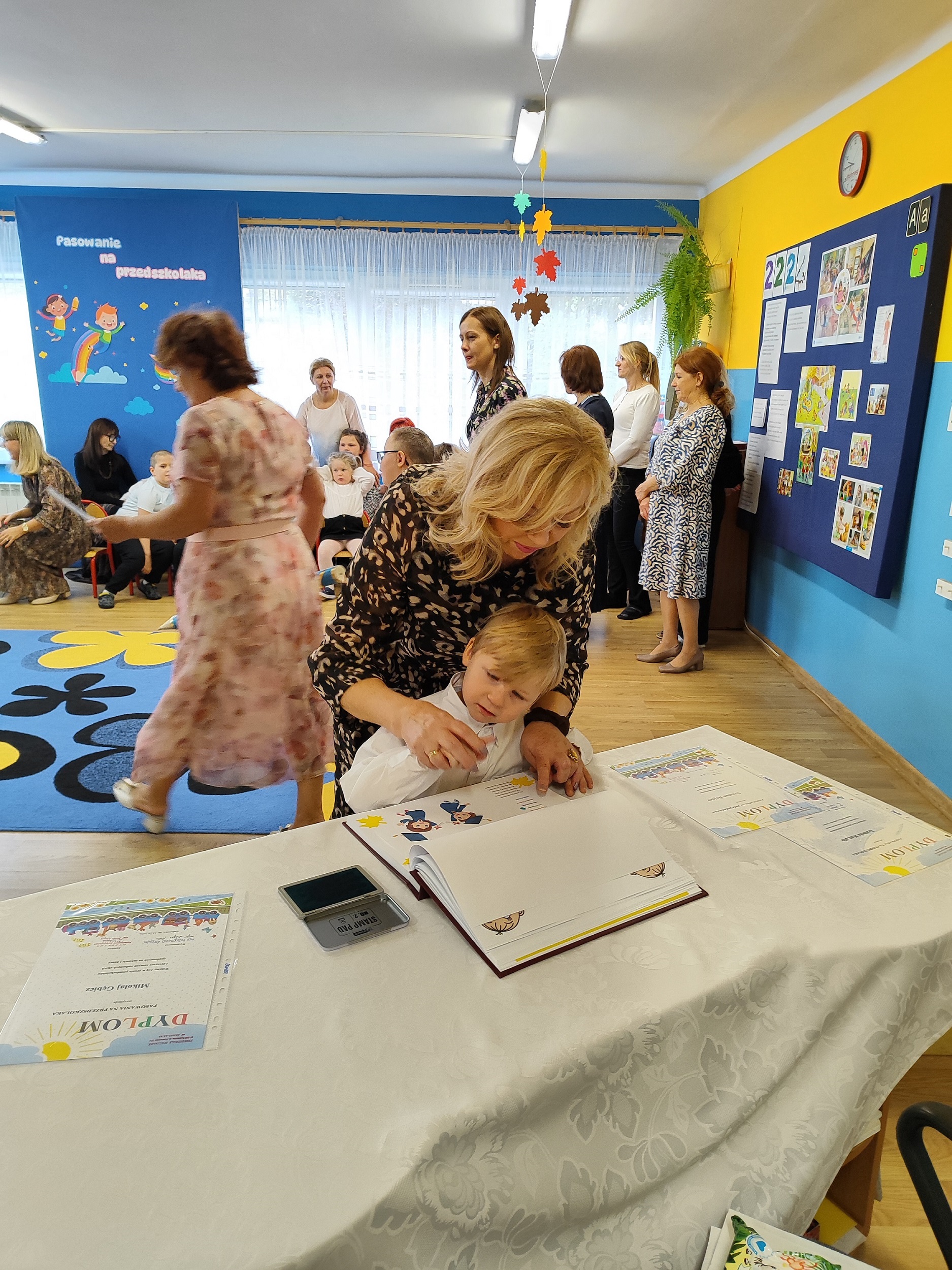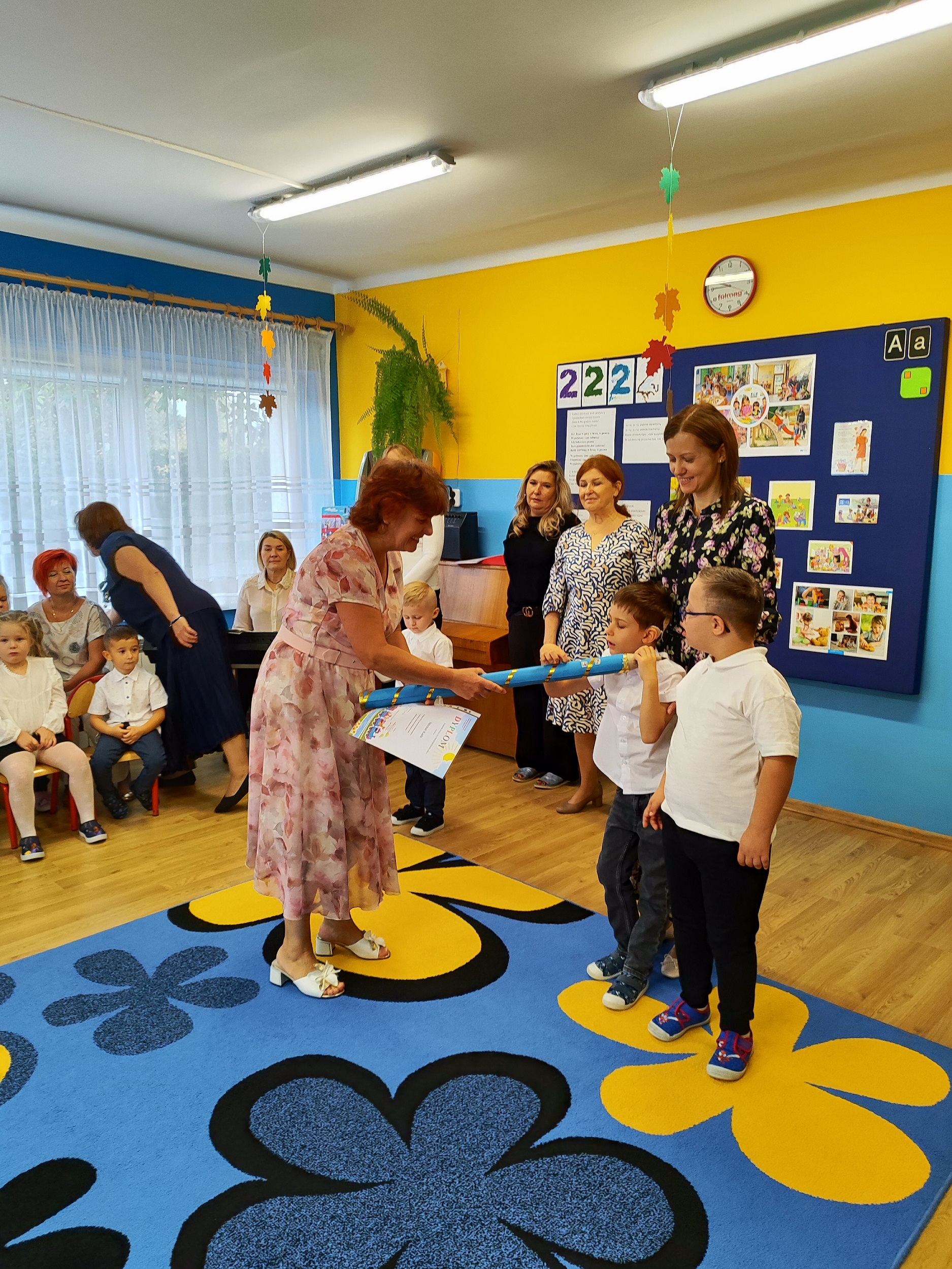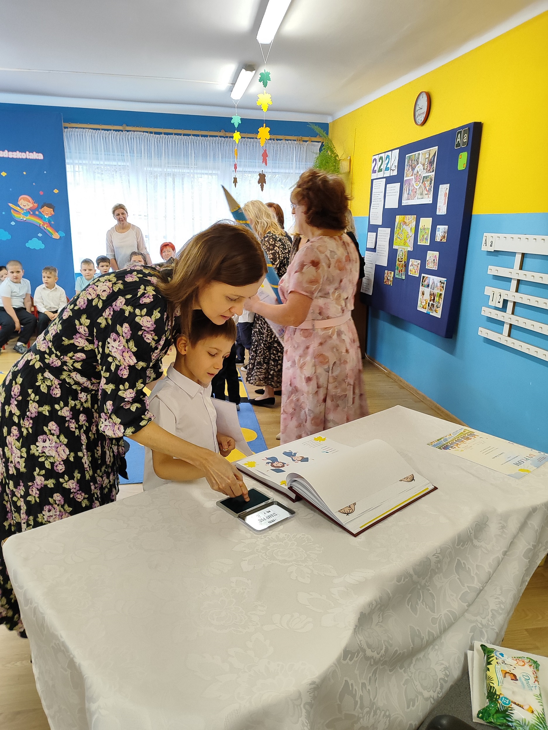 W tym roku uroczystość Pasowania na przedszkolaka odbyła się 14 października. Pani dyrektor Maria Klauza powitała przedszkolaków oraz przybyłych gości. Następnie dzieci zaprezentowały program artystyczny. W wierszach, tańcach i piosenkach pokazały jak w przedszkolu bawią się, uczą, poznają świat i stają się coraz bardziej samodzielne. Niejednej mamie oraz tacie łza wzruszenia zakręciła się w oku z dumy i radości, że oto ich pociecha staje się prawdziwym przedszkolakiem. Po części artystycznej nastąpił Akt pasowania. Pani dyrektor symbolicznym dotknięciem „zaczarowanego ołówka” przyjęła do grona naszych wychowanków czworo dzieci: Szymona, Michała, Mikołaja i Filipa. Na pamiątkę tego wyjątkowego wydarzenia dzieci otrzymały piękne dyplomy oraz dokonały „wpisu” do Kroniki przedszkola odciskając swoje paluszki.